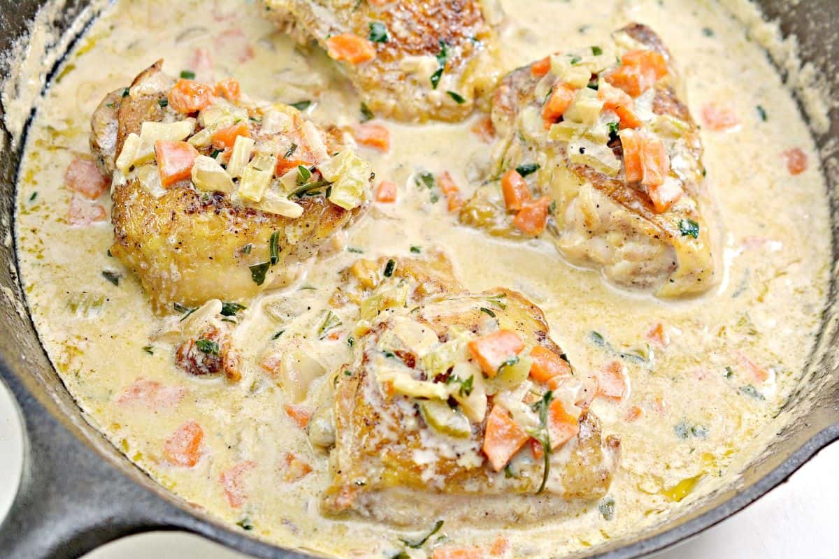 Low Carb Chicken Fricassee dresses up chicken with a rich, creamy sauce. Basic ingredients transform into something elegant and cozy. It’s a great example of simple cooking done well.